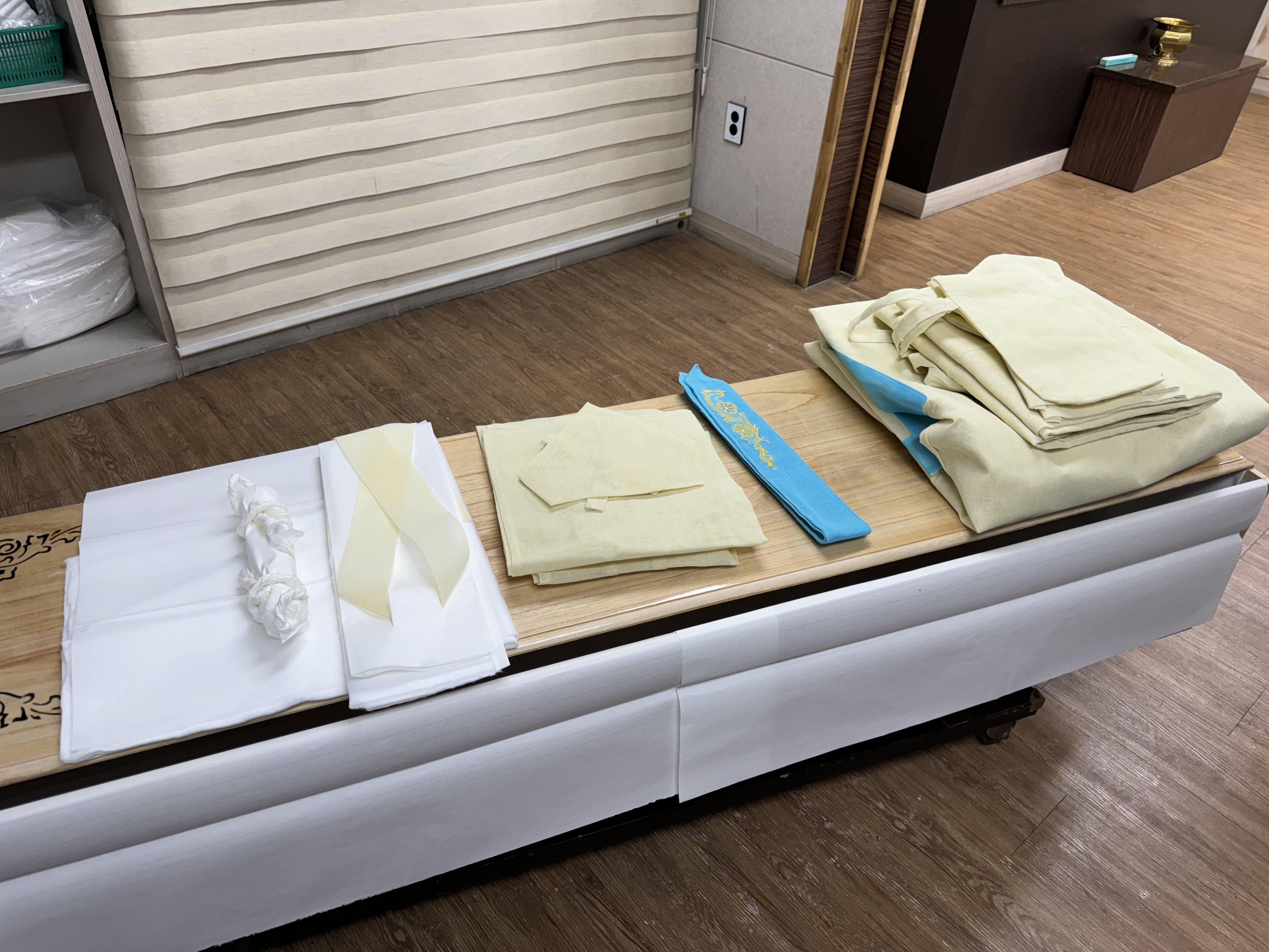 두 번째는 입관 용품 정리 기준을 정해두는 것이에요. 손수건은 몇 장, 베개는 어떤 두께, 덮개는 어느 정도, 고정틀 위치는 어떻게 넣을 것인지에 대한 나만의 기준을 갖고 입관에 들어가야 뚜껑이 닫히지 않을 가능성을 크게 줄일 수 있어요. 막무가내로 이것저것 다 넣다 보면 결국 뚜껑 안 닫히는 건 시간문제예요.